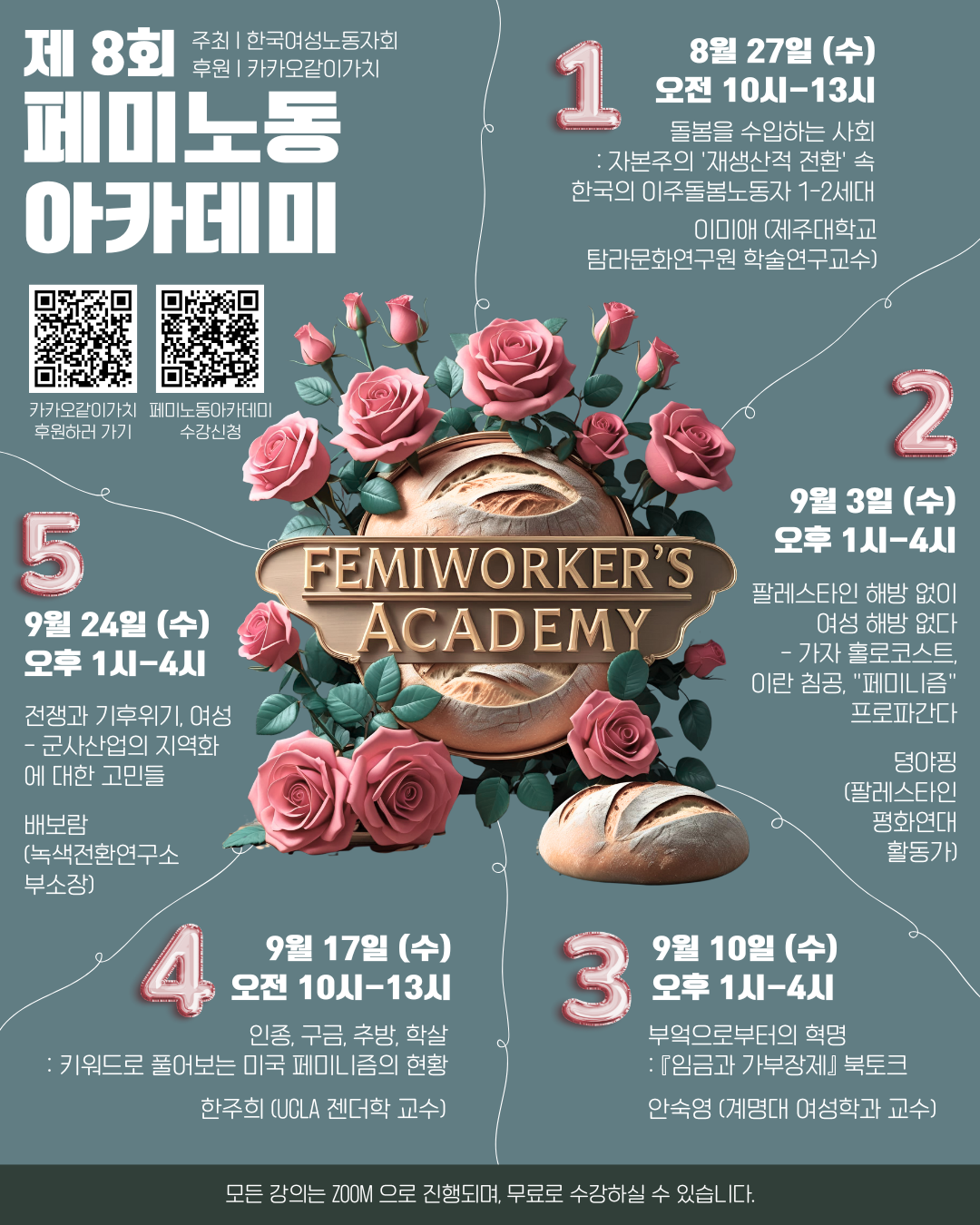 올해의 <제 8회 페미노동아카데미>는 특별합니다. 전쟁과 테러의 위협, 극우와 혐오세력의 부상이 글로벌 위기로 나타나는 지금, <제 8회 페미노동아카데미>는 이를 '여성노동'과 '페미니즘'의 관점으로 바라보고자 합니다. <제 8회 페미노동아카데미>는 현실을 진단하고 대안을 상상하는 연대의 장이 될 것입니다.