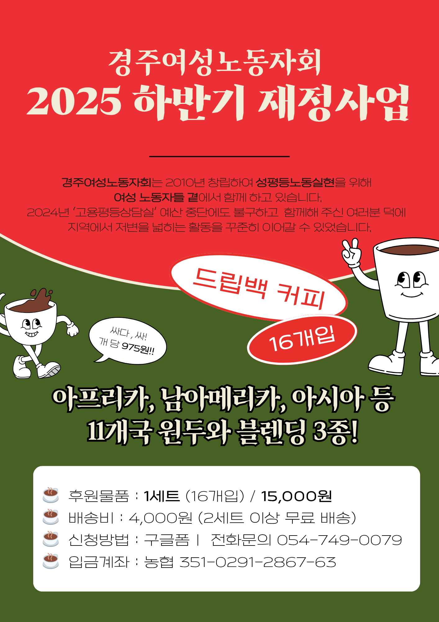 경주여성노동자회는 2010년 창립하여 성평등노동실현을 위해 여성 노동자들 곁에서 함께 하고 있습니다. 2024년 ‘고용평등상담실' 예산 중단에도 불구하고 함께해 주신 여러분 덕에 지역에서 저변을 넓히는 활동을 꾸준히 이어갈 수 있었습니다. 올 하반기에도 지속적인 활동이 가능할 수 있도록 마구마구 주문해 주세요!☕ 후원물품 : 1세트 (16개입) / 15,000원☕ 배송비 : 4,000원 (⭐2세트 이상 무료 배송⭐)☕ 신청방법 : 구글폼ㅣ 전화문의 054-749-0079☕ 입금계좌 : 농협 351-0291-2867-63 |