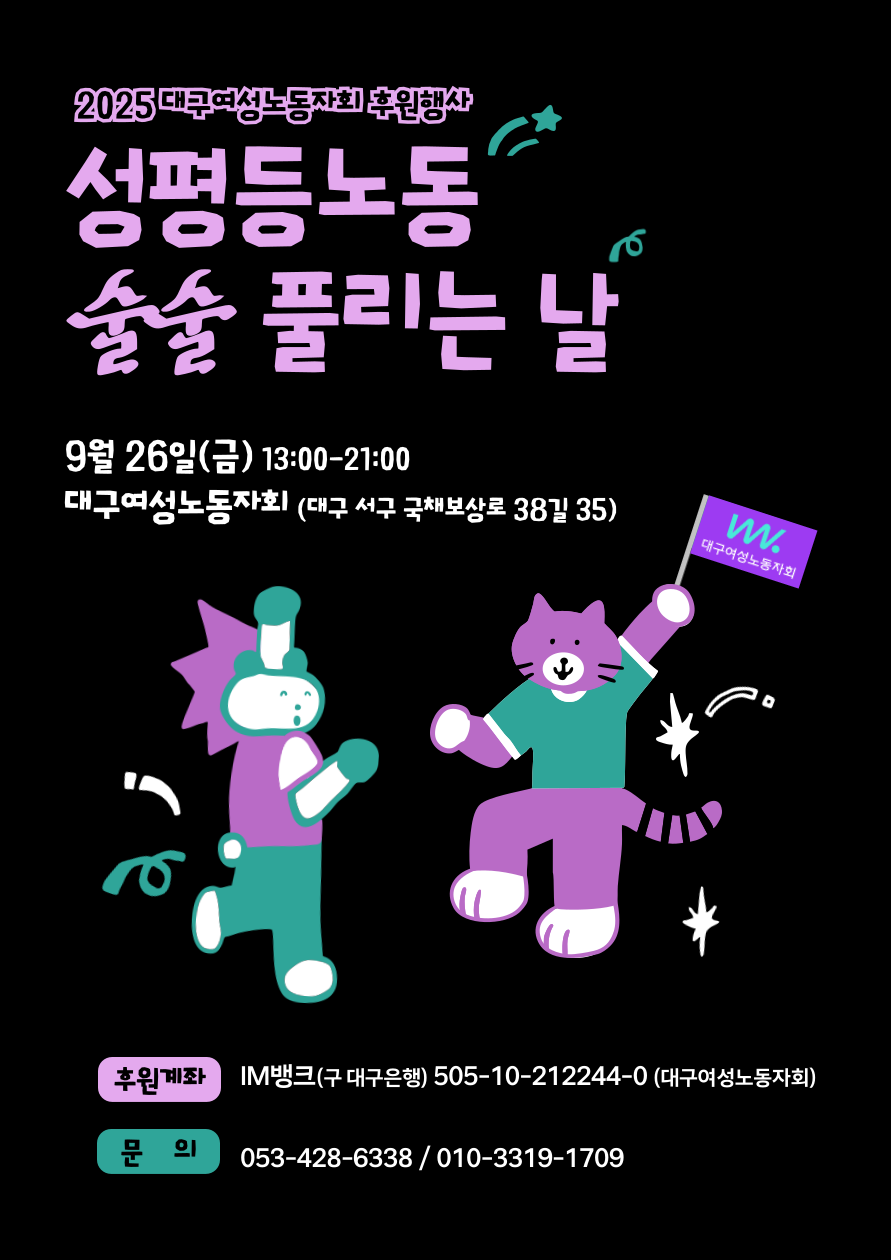 ✨ 일시 : 2025년 9월 26일 (금) 13:00 - 21:00 ✨ 장소 : 대구여성노동자회(대구 서구 국채보상로 38길 35 1층) ✨ 후원계좌 : iM뱅크(구.대구은행) 505-10-212244-0 (대구여성노동자회) ✨ 문의 : 053-428-6338