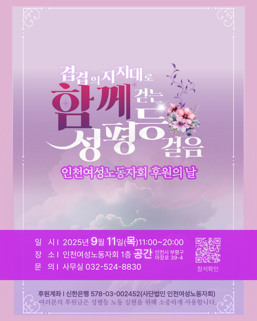 💟일시: 2025년 9월 11일 목요일 11:00 ~ 20:00 💟장소: 인천여성노동자회 1층 공간 (인천시 부평구 마장로 39-4) 💟후원계좌: 신한은행 578-03-002452 사단법인 인천여성노동자회