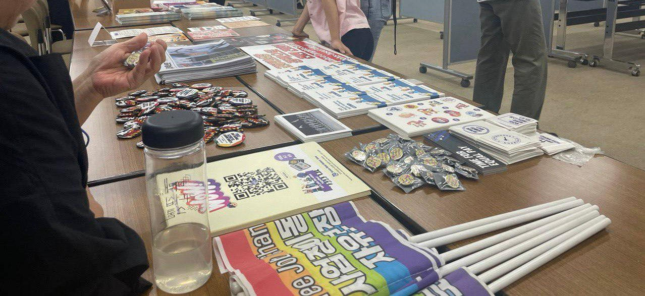 첫 날 오프닝 세션에서는 심도깊은 논의보다는 각국의 상황을 간단히 소개하고, 대회의 시작을 알리는 시간을 가졌는데요. 한국팀은 임을 위한 행진곡을 다함께 부르며 한국의 노동운동가를 소개하였습니다. 또 각 국의 노동운동을 소개하기 위해 준비된 전시를 보기도 하고, 노동운동과 관련한 물품들을 가져가 배포하기도 했습니다. 한국여성노동자회는 여성노동운동을 하는 만큼 ‘생계에 성별은 없다’ 뱃지와 윤석열 퇴진 광장에서 시민들에게 무료로 배포한 굿즈, 그리고 성평등노동의 가치를 담아둔 스티커를 가져가 나눠드리기도 했습니다. 전시회장에 다양한 페미니즘과 노동운동을 상징하는 뱃지를 가져가기도 했는데요, TIME FOR EQUAL PAY 담요에 걸어두었더니 유심히 보고 가시는 분들이 많았고 질문을 받아 설명을 드리기도 했습니다.
