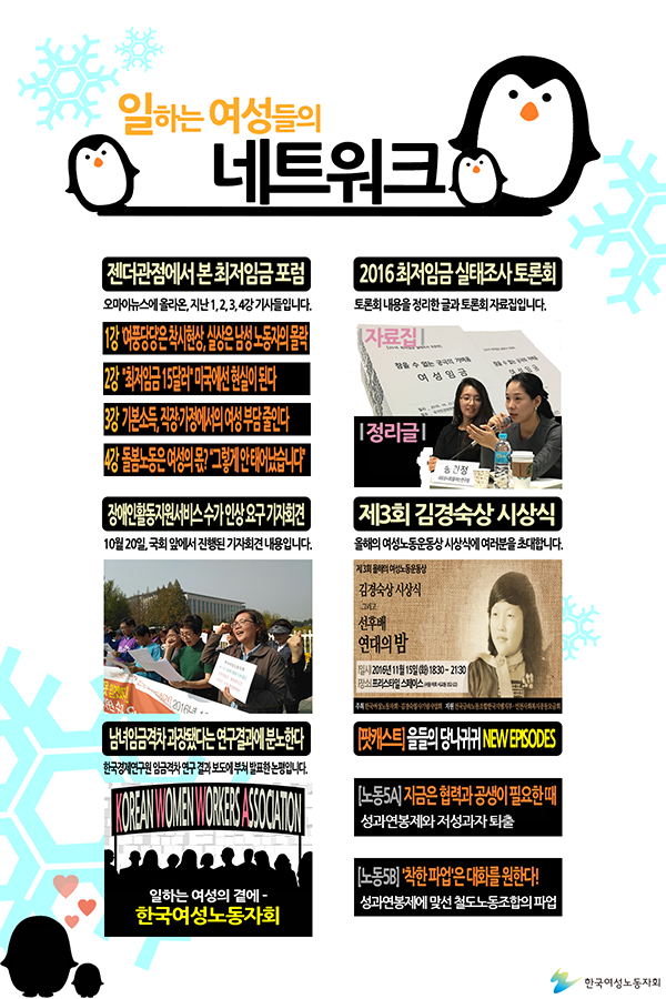 한국여성노동자회는 Mail-Zine, <일하는 여성들의 네트워크>를 통해 매 달 월말에 지난 한 달 간의 활동 내용을 담아 구독자분들께 전해드리고 있습니다.