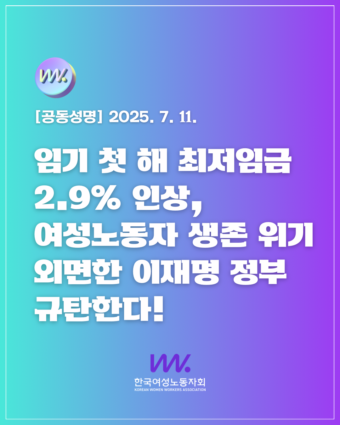 여성노동자의 ‘인간다운 삶’을 외면한 이재명 정부와 최저임금위원회를 규탄한다. 낮은 최저임금은 노동자의 생존을 위협할 것이다. 이재명 정부는 저임금 노동자들의 삶을 보완할 대책을 즉각 마련하라. △최저임금 산입 범위 개선 △실질 임금 보장 △성별임금격차 해소 △적용범위 확대 등에 대한 의지를 보여라. 나아가 성평등 노동 실현으로 사회대개혁과 노동존중의 책임과 역할을 다하길 바란다.