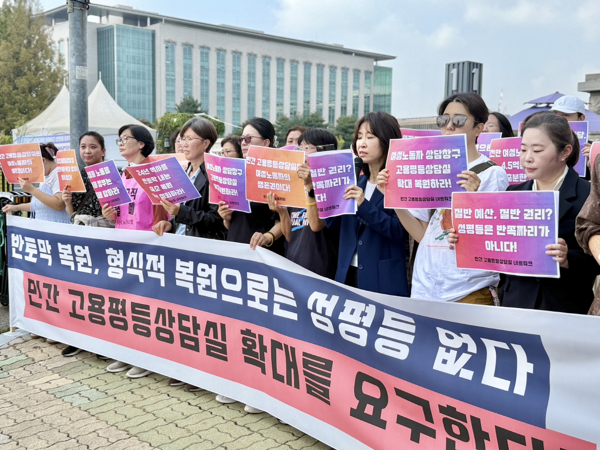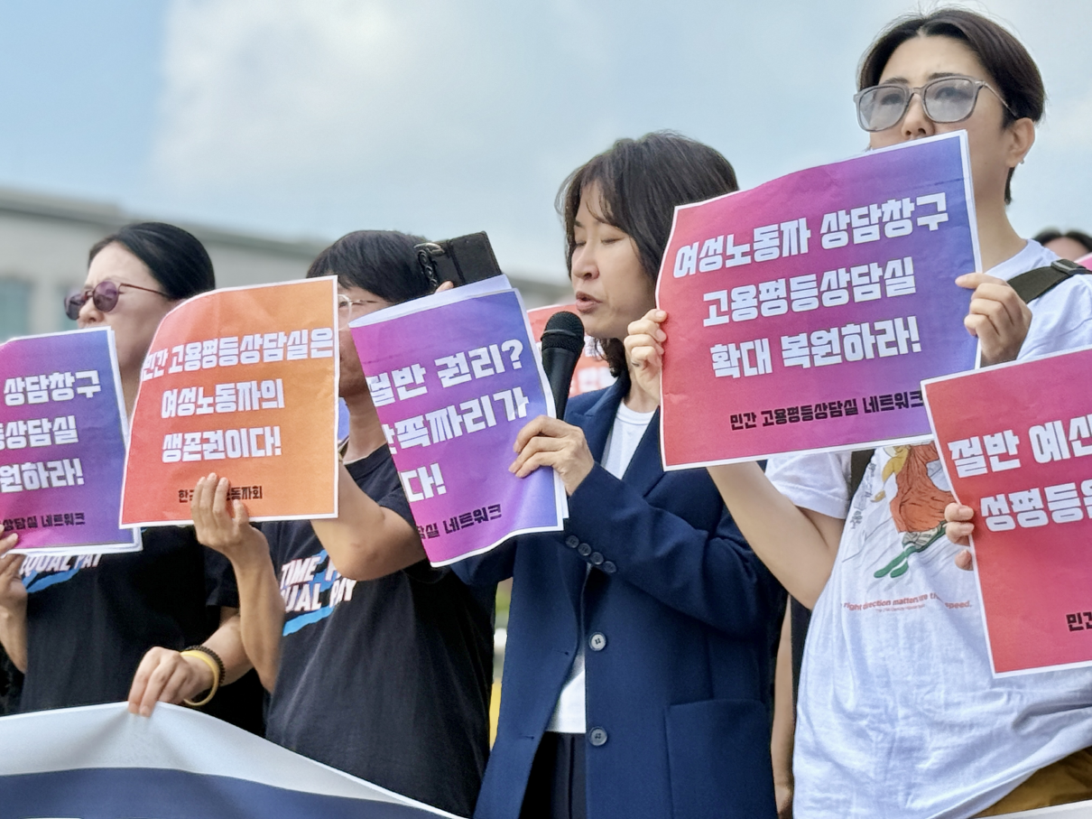 민간고용평등상담실네트워크와 한국여성노동자회가 1일 국회 앞에서 기자회견을 열고 "반토막 복원으로는 성평등 노동을 실현할 수 없다"며 민간 고용평등상담실의 전면 확대를 촉구했다.
