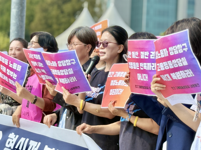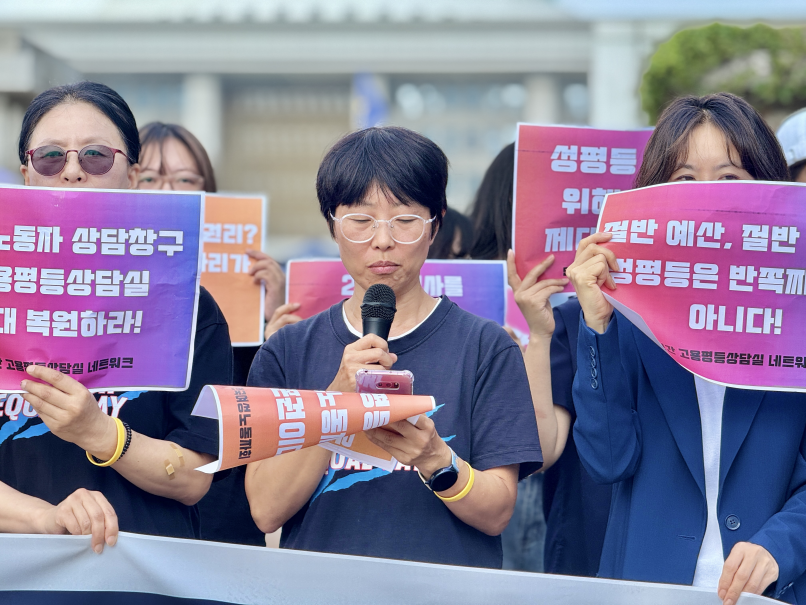 한국여성노동자회 김지혜 부대표는 취지발언을 통해 "여성노동자 1천만명 시대에 OECD 최하위 성별임금격차는 구조적 차별의 결과"라며 "고용노동부 여성고용정책과 폐지는 천만 여성노동자에 대한 외면"이라고 비판했다. 그는 "2026년 예산안에 민간 고용평등상담실 예산이 2023년 대비 3분의 1 수준(4억5천만원)으로 책정되고 운영 개소도 19개에서 9개로 축소됐다"며 "고용노동부는 성평등 노동을 실현할 강력한 추진체계를 구축해야 한다"고 강조했다. 전국여성노동조합은 연대발언에서 "윤석열 정부가 24년간 운영된 상담실을 하루아침에 폐지했다"며 "직장 내 성희롱·성폭력·갑질 등을 당한 여성노동자들은 신분 노출을 기피해 익명 상담 비중이 높은데, 예산 없는 정책은 헛구호에 불과하다"고 지적했다.
