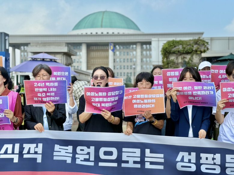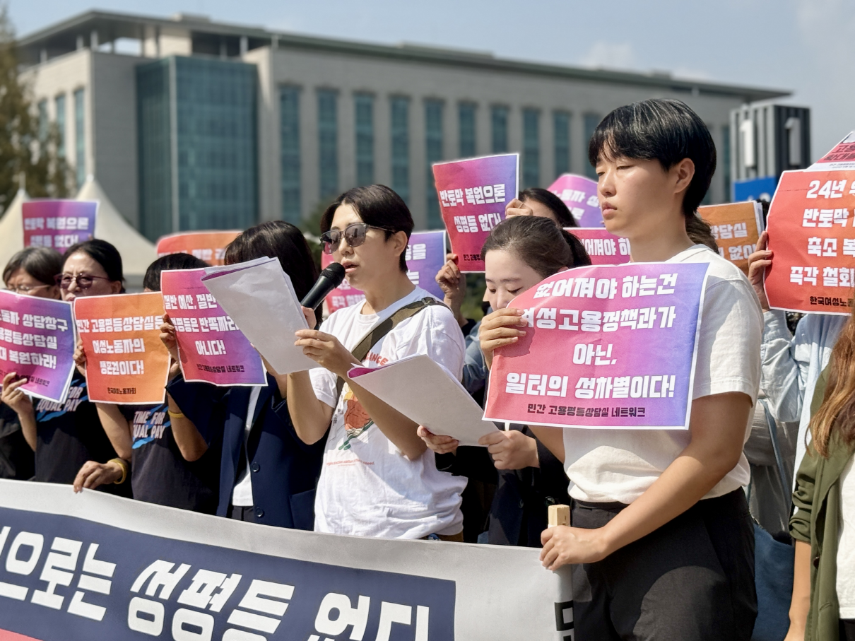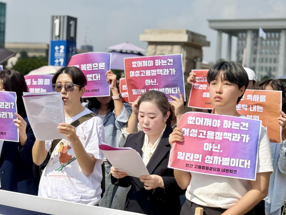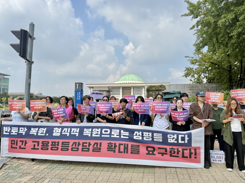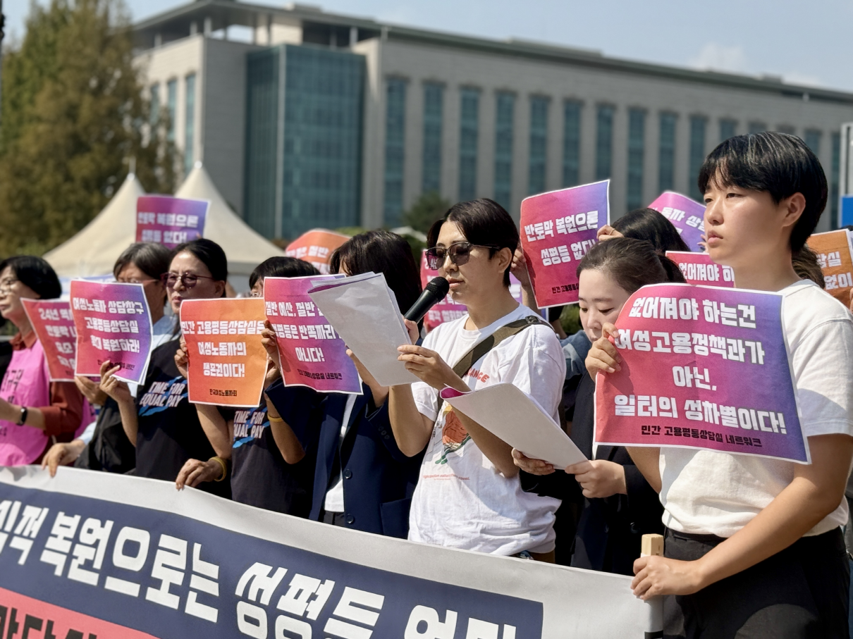 이재명 대통령은 UN연설에서 "AI 시대의 변화에 수동적으로 끌려다닌다면 기술 악용으로 인한 인권침해의 그 어두운 그림자를 떨쳐내지 못한 채 양극화와 불평등 심화라는 디스토피아를 맞이하게 될 것"이라고 말했다. 그러나 여성노동자에게 지금의 대한민국은 이미 성차별 디스토피아다. 직장 내 성희롱, 성차별로 인한 피해는 여전히 그 사실을 인정받기 어려운 것이 현실이기 때문이다. 여성노동자의 일경험에 드리운 "인권침해의 어두운 그림자"를 떨쳐내기 위해서는 무엇보다 성평등 노동 실현을 위한 정책 수립과 실행을 위한 정부의 노력이 필요하다. 그 첫걸음은 민간 고용평등상담실 복원을 넘어 확대여야 한다. 우리는 다음과 같이 요구한다.