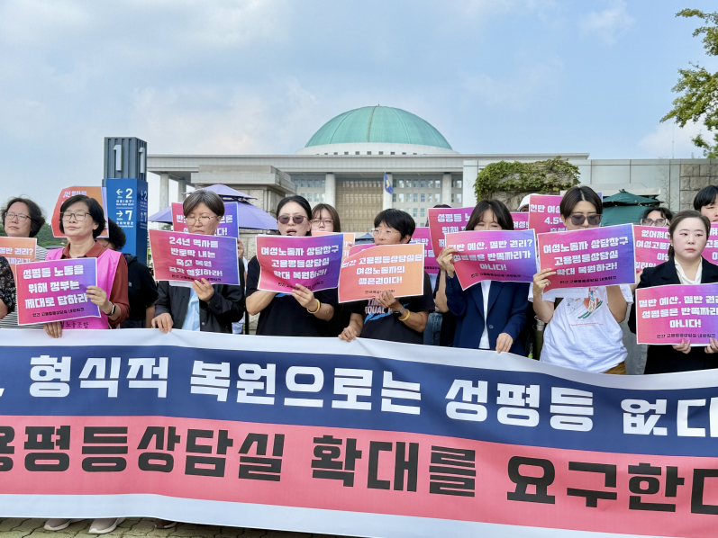 [기자회견문] 반토막 복원, 형식적 복원으로는 성평등 없다. 민간 고용평등상담실 확대를 요구한다! 2023년 기준 여성노동자 수가 사상 최초로 1천만명을 돌파했으며, 현재도 지속적으로 증가하고 있다. 전체 인구 5천만명 중 1천만명이 넘는 사람들이 여성노동자이다. 그러나 우리나라는 OECD 가입 이후 지금까지 성별임금격차 1위라는 불명예를 한 번도 벗지 못하고 있다. 유리천장지수에서도 다른 국가들을 제치고 항상 최하위를 기록해 왔다. ‘여성의 노동환경이 가혹한 국가’는 항상 문화강국, 경제대국 한국에 추가로 붙는 불명예 수사다. 이러한 성차별은 그 어떤 위협보다 심각한 사회적 문제다. 수많은 학자들과 연구는 한국사회 성차별의 심각성을 지목해 왔다. 특히 노동시장에서의 성차별은 사회 발전을 저해하는 심각한 요소라는데 이견이 없다. 이런 현실에서 정부가 해야할 일은 명확하다. 성평등하고 안전하며 적정임금을 받는 일터를 만드는 데 그 어떤 부분에서보다 많은 노력을 기울이는 것이다. 현 정부는 지금껏 다양한 분야에서 윤석열 정권의 과오를 바로잡고 새 시대를 위한 청사진을 제시해 왔다. 한편 이재명 대통령은 현 정부를 ‘국민주권정부’라 칭했다. “국민이 주인이 된다”는 의미라고 했지만 현 정부 아래 여성노동자의 권리는 존중받지 못 하고 있다. 심각한 성차별 상황에 처해 있는 여성노동자가 천만명이 넘지만 현재까지 정부의 발표 중에 여성노동자를 위한 성평등 일터의 로드맵과 방향, 정책은 없다. 여성가족부를 성평등가족부로의 확대 개편한다는 발표 아래 고용평등 임금공시제 도입과 조직문화 개선으로 성평등한 일터 조성 등의 내용을 담고 있다. 그러나 여성가족부에 근로감독 권한과 행정집행권이 부재한 상황에서 해당 제도를 어떻게 운용할 것인지에 대한 방안은 그 어디에도 없다. 그뿐 아니라 성평등 노동 실현을 위한 고용노동부의 역할과 책임은 어디에도 명시되어 있지 않다. 코로나19 팬데믹과 윤석열 정권이라는 악재를 거치면서 여성노동자들의 일자리 질은 더욱 나빠졌다. 시간제 노동자들이 급증하였고, 비정규직 중 비전형 노동자들이 급증하고 있다. 2023년 기준, 비정규직 여성의 약 절반은 가내, 파견, 용역, 특수형태 근로자를 포함한 비전형 노동자에 해당한다. 정부는 이러한 현실을 알고 있는가, 이에 대한 대책을 고민하고는 있는가. 민간 고용평등상담실 전면 폐지는 윤석열 정부의 과오 중 하나로 지목된 바 있다. 이재명 정부는 민간 고용평등상담실을 복원하겠다 했으나, 그 계획은 형식적인 수준이다. 고용노동부가 국회로 넘긴 2026년 예산안을 보면 2024년 예산 전액 삭감으로 폐지된 민간 고용평등상담실 예산이 2023년 기준 1/3로 책정되어 있다. 기존 19개소였던 민간 고용평등상담실을 9개소로 운영하고 정부가 운영하던 고용평등상담창구는 존치하겠다는 계획이다. 그러나 현재 정부가 운영하는 고용평등상담창구는 구조적 한계를 드러내고 있다. '노동부 진정 절차를 거치지 않으면 상담 진행이 불가하다'는 경직된 운영 방식과 더불어, 고용노동부 내부사업이라는 특성상 근로감독관의 판단에 대해 이의를 제기하기 어려운 상황이다. 이러한 구조적 문제점들로 인해 정부 고용평등상담창구를 통해 접수된 사건들조차 결국 민간단체로 재상담해오는 상황이 이어지고 있다. 이런 상황에서 정부는 한가하게 4억 5천으로 민간 고용평등상담실을 운영하겠다는 계획을 내 놓고 있다. 정부가 2026년 편성한 AI예산은 10조 1천억이다. 이 예산의 1,000분 1만이라도 성평등 노동에 배정하라는 것이 그리 큰 요구는 아니다. 이재명 대통령은 UN연설에서 "AI 시대의 변화에 수동적으로 끌려다닌다면 기술 악용으로 인한 인권침해의 그 어두운 그림자를 떨쳐내지 못한 채 양극화와 불평등 심화라는 디스토피아를 맞이하게 될 것"이라고 말했다. 그러나 여성노동자에게 지금의 대한민국은 이미 성차별 디스토피아다. 직장 내 성희롱, 성차별로 인한 피해는 여전히 그 사실을 인정받기 어려운 것이 현실이기 때문이다. 여성노동자의 일경험에 드리운 "인권침해의 어두운 그림자"를 떨쳐내기 위해서는 무엇보다 성평등 노동 실현을 위한 정책 수립과 실행을 위한 정부의 노력이 필요하다. 그 첫걸음은 민간 고용평등상담실 복원을 넘어 확대여야 한다. 우리는 다음과 같이 요구한다. 정부는 성평등 노동 실현을 위한 예산과 인력을 대폭 확대하라! 정부는 민간 고용평등상담실 확대 계획을 수립하고 예산을 확충하라! 국회는 민간 고용평등상담실 예산을 대폭 확대하라! 우리는 성평등 노동 실현하는 정부를 원한다. 성평등 노동 정책의 로드맵을 제시하라! 2025. 10. 1