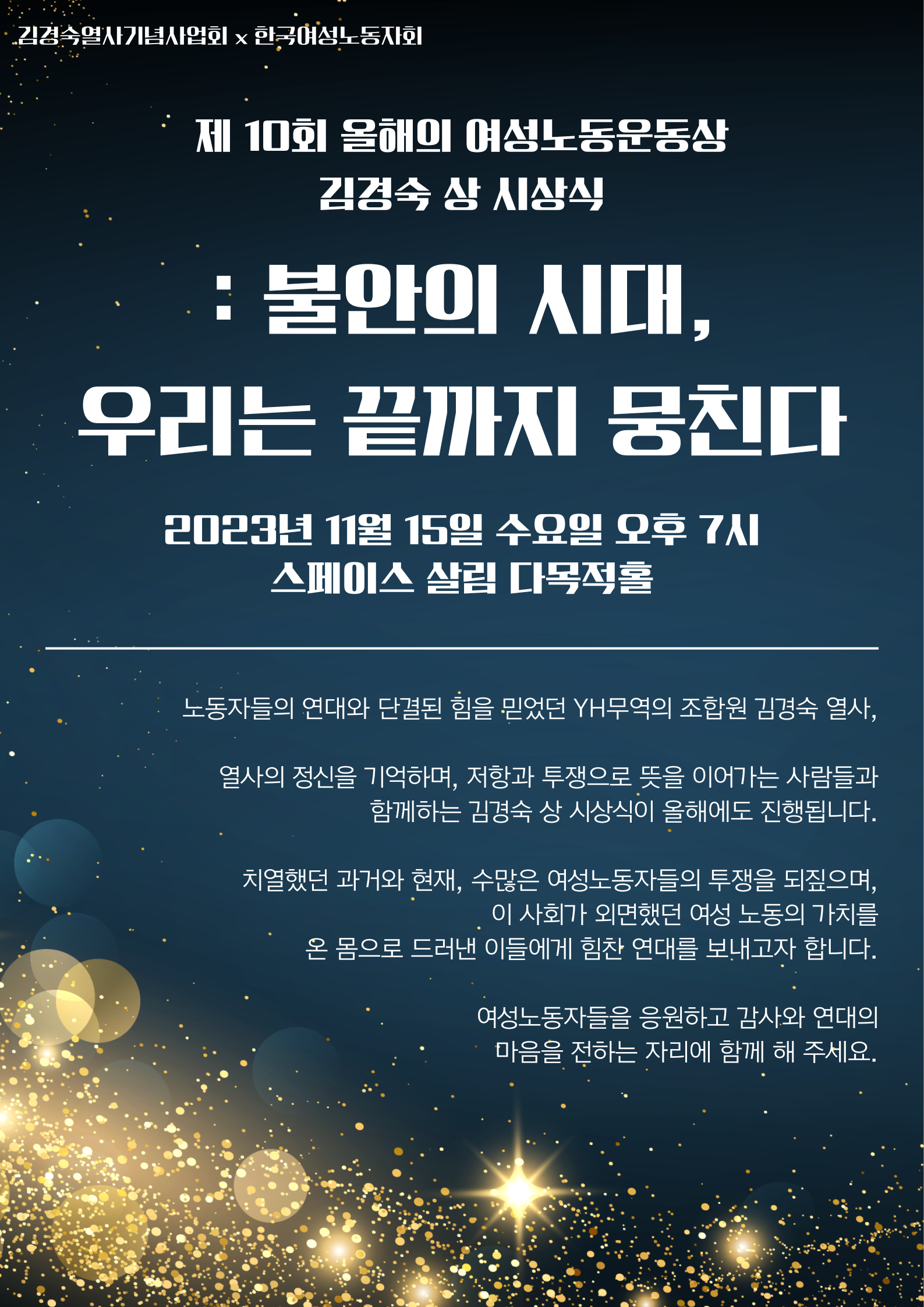 ※ [붙임 1] 2023년 ‘제 10회 올해의 여성노동운동상 ‘김경숙상’ 시상식(1부)‘ 및 ‘토크쇼 : 불안을 뚫고 나간 우리의 순간들(2부)’ 상세