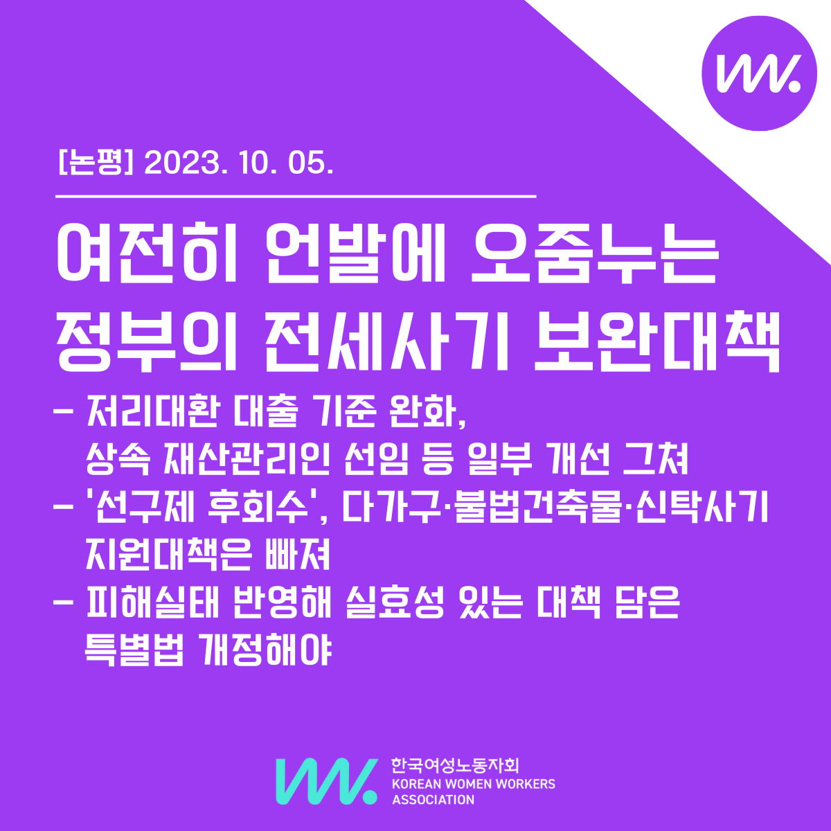 오늘(10/05) 국토교통부는 △저리 대환대출의 요건 완화 △신탁·다가구·근생빌라 및 외국인·재외동포 피해자에 대한 공공임대주택 지원 △피해자 법률지원 확대 △피해자 온라인 지원관리시스템 개발 △전세피해지원위원회 회의내용 공개 근거 마련 등의 내용을 담은 전세사기 피해자 지원 보완방안을 발표했다. 전재산과 다름없는 보증금을 모두 잃고 높은 전세대출 이자로 이중고를 겪던 더 많은 피해자들이 저리 대환대출을 활용할 수 있도록 요건이 완화되고 임대인 사망과 상속 문제로 아무런 구제를 받을 수 없던 피해자들의 소송절차를 공공이 지원하는 등 일부 나아진 부분도 없지 않다. 그러나 여전히 정부는 피해자들의 문제를 근본적으로 해결하기 위한 방안을 내놓기 보다는 언발에 오줌누기식의 자잘한 방안들을 조금씩 늘어놓으면서도 피해자 지원이 전방위로 이루어지는 것 같은 모양새를 만드는데 급급해보인다. 정부와 국회는 전세사기 특별법 시행 6개월 내에 부족한 부분을 점검하여 보완입법을 내놓겠다고 약속한만큼 오는 11월 정기국회에서 ‘선구제 후회수’ 방안과 같은 근본대책을 마련하고 재발방지를 위한 입법에 즉각 나서야 한다.