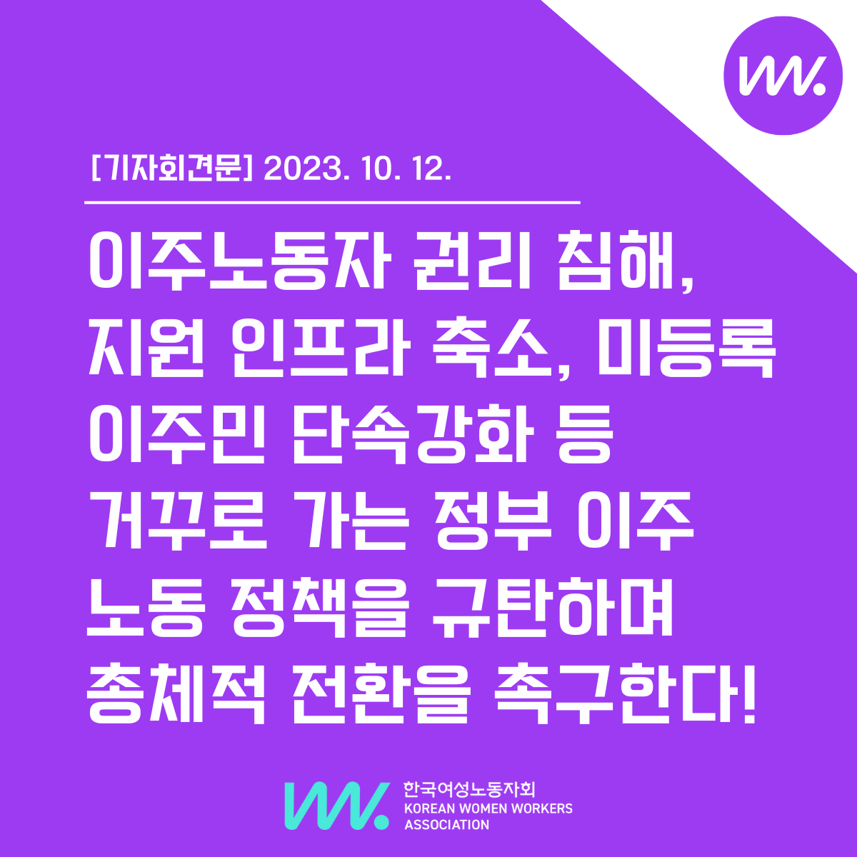 하루가 멀다 하고 발표되는 정부의 이주노동자 관련 정책에 정작 이주노동자 처우개선, 권리보장, 제도개선은 없다. 인력이 부족한 산업, 업종에 기업이 필요로 하는 만큼의 이주노동자를 대폭 확대 공급하는 데에만 정책 초점이 맞춰져 있는 반면, 열악하고 취약한 이주노동자들의 노동, 주거, 안전, 건강, 생활 등 노동과 삶을 개선하는 것은 외면하고 있다. 이주노동자가 일만 하는 기계나 노예인가, 쓰다가 버리면 되는 일회용품인가. 이민정책을 말하고 이민청을 만들겠다고 하며 노동력 부족과 인구절벽에 직면해 이주노동자를 해결책의 일부로 본다는 정부가 숫자만 늘리고 권리는 박탈하고 지원은 축소하는 것이 말이 되는가. 권리도 지원도 없이 착취와 차별 속에서만 살아가라는 것이 정부의 본심인 것인가!