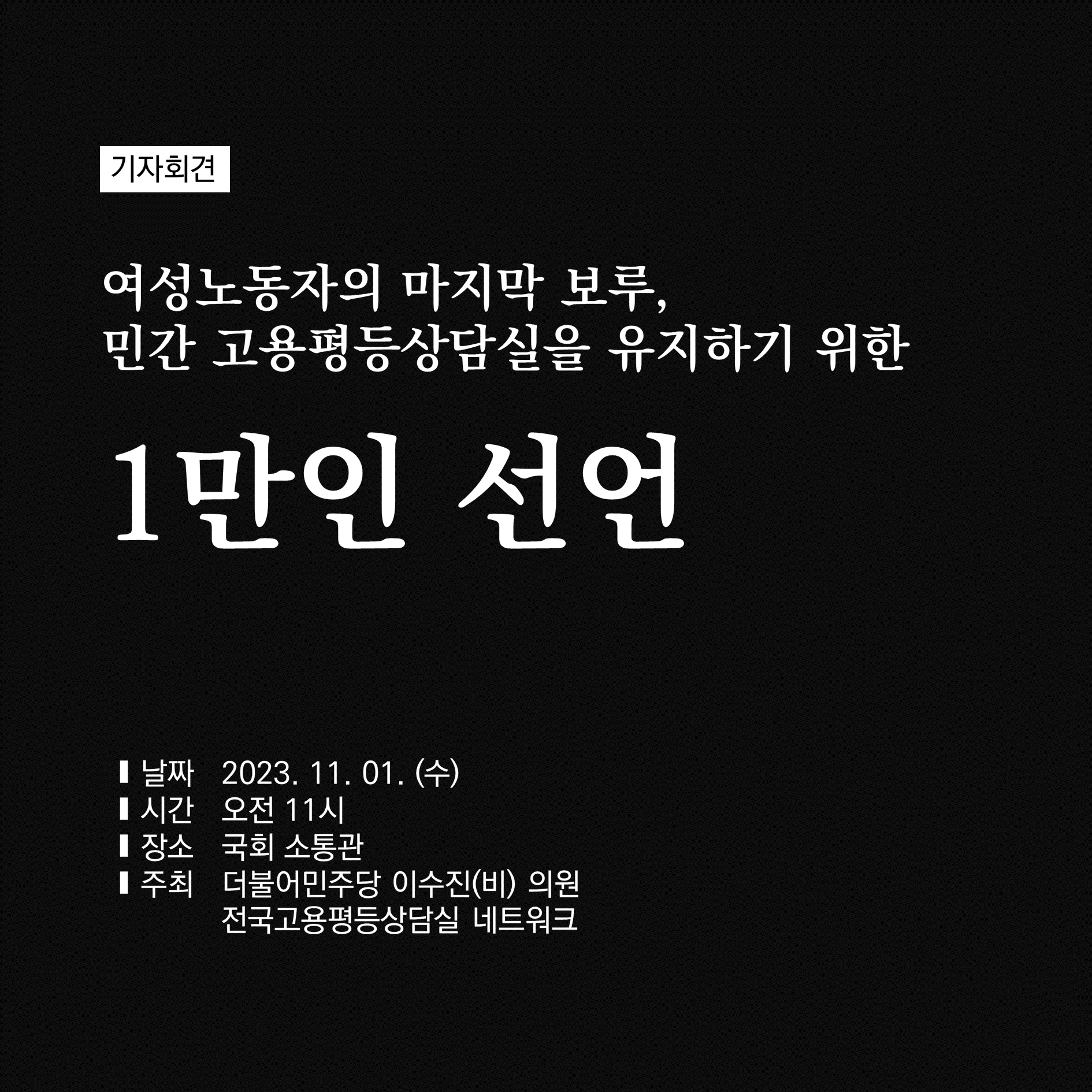 ▮날짜: 2023. 11. 01. (수) ▮시간: 오전 11시 ▮장소: 국회 소통관 ▮프로그램 ▶모두발언: 인천여성노동자회 박명숙 대표 ▶국회의원 발언: 이수진 의원 ▶내담자 발언(대독): 수원여성노동자회 최희정 실장 ▶민간 고용평등상담실 폐지를 반대하는 1만인 선언문 낭독: 대구여성회 김예민 대표 ▶민간 고용평등상담실 폐지를 반대하는 1만인 선언 전달: 부천여성노동자회 김정연 대표 |